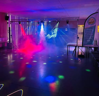 Grote disco op statieven met: rookmachine, discolichten en box (te verbinden met Bluetooth) €400