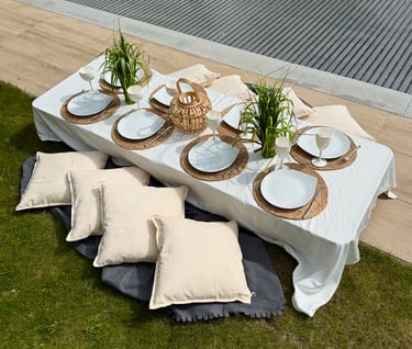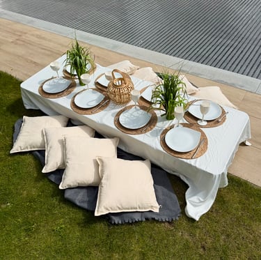 - Wens je graag een 'low dining table' met kussens, tafelkleed, borden, bekers, bestek en rieten placemats? Dan kan je dit bijboeken voor 5€/ persoon extra. (We wensen na gebruik graag alles afgewassen terug, indien dit niet lukt rekenen wij 3€/ persoon extra aan. Alles mag in de vaatwasser...). Onze 'Low dining table' kan voor maximaal 8 personen geboekt worden.