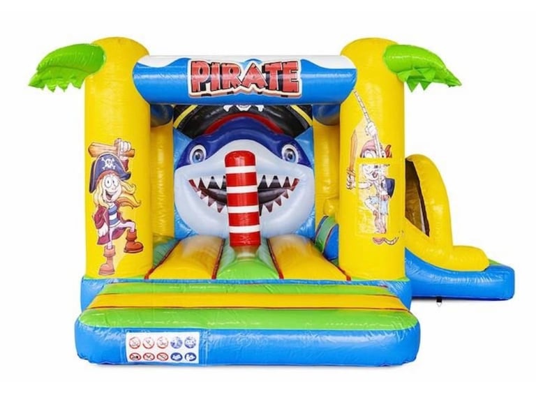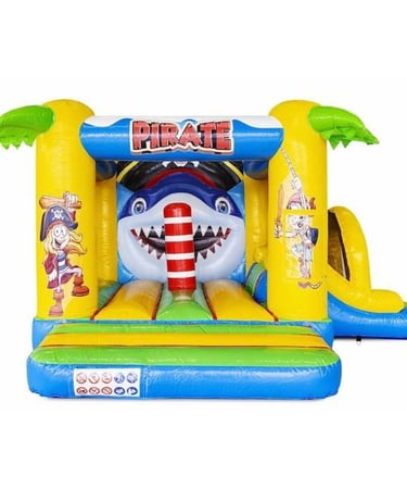 Dit compacte springkasteel met glijbaan en speelobject is geschikt voor elke gelegenheid. Speel en spring samen met de piraten, trotseer oceanen en pas op voor de grote haai! Ga jij het avontuur aan?